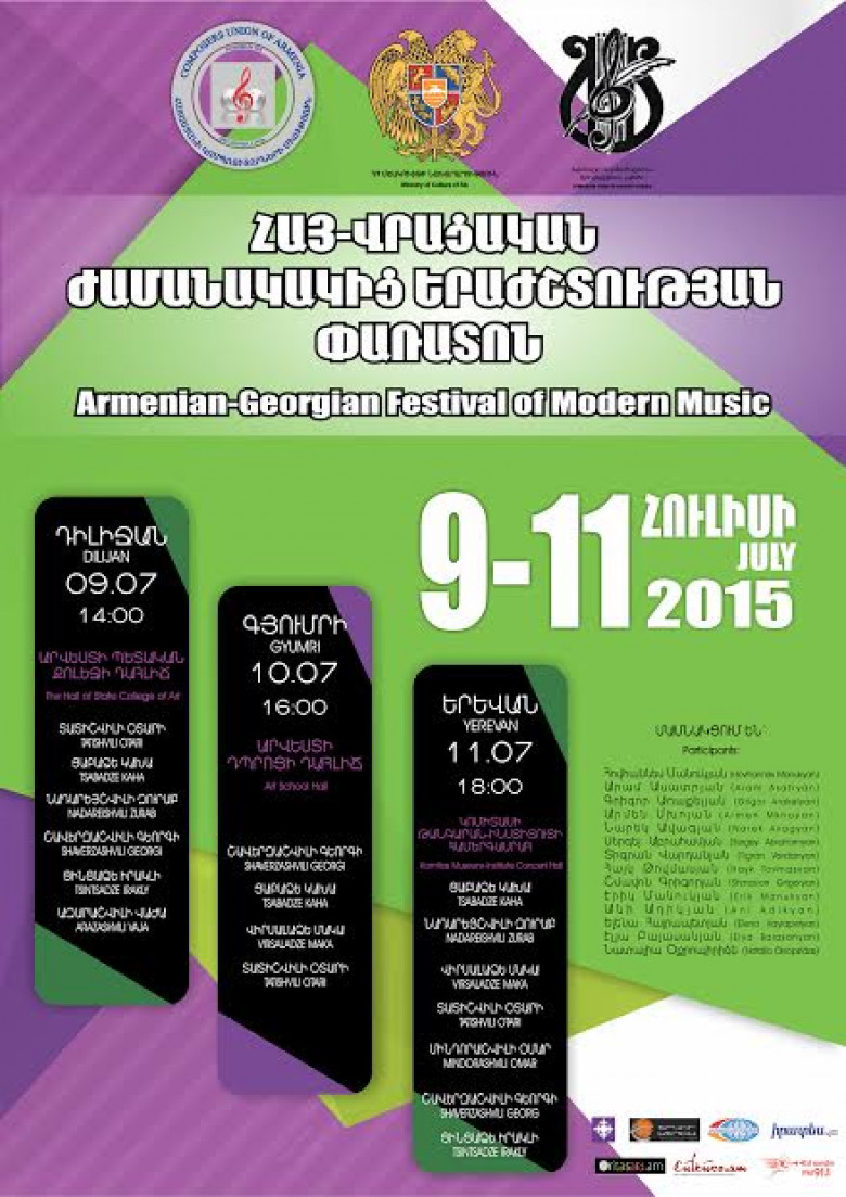 ՄշակույթՀուլիսի 9-ից 11-ը Հայաստանում կմեկնարկի Հայ-Վրացական ժամանակակից երաժշտության փառատոնը: Հայաստանի Կոմպոզիտորների Միության նախաձեռնությամբ ՀՀ Մշակույթի նախարարության աջակցությամբ ու Վրաստանի Կոմպոզիտորների Միության հետ համատեղ տեղի ունեցող այս նախագիծը կկայանա հանրապետության երեք քաղաքներում՝ Դիլիջանում (Արվեստիպետականքոլեջիդահլիճ, ժամը 14:00), Գյումրիում (Արվեստիդպրոցիդահլիճ, ժամը 16:00) և Երևանում (Կոմիտասիթանգարան-ինստիտուտիհամերգասրահ, ժամը 18:00): Երեք համերգային օրերի ընթացքում կհնչեն Օտարի Տատաշվիլիի, Կախա Ցաբաձեի, Գեորգի Շավերզաշվիլիի, Զուրաբ Նադարեյշվիլիի, Օմար Մինդորաշվիլիի, Իրակլի Ցինցաձեի, Վաժա Ազարաշվիլիի և Մակա Վիրսալաձեի կամերային ստեղծագործություններից՝ հայ երաժիշտների կատարմամբ: Թվարկված վերջին երեք հեղինակները Վրաստանից ժամանող պատվիրակության հետ ներկա կգտնվեն համերգներին: Ի դեպ, վրացական պատվիրակությունըՀայաստան կժամանի հուլիսի 8-ին: