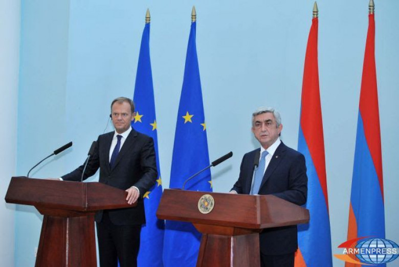 ՄիջազգայինԵվրամիությունը պատրաստակամ է խորացնել հարաբերությունները Հայաստանի հետ, առաջ գնալ, շուկաներ բացել, նպաստել ժողովրդավարության զարգացմանը գործարար ներդրումների բարելավմանը: Այս մասին հայտարարեց Եվրոպական խորհրդի նախագահ Դոնալդ Տուսկը` ՀՀ նախագահական նստավայրում Նախագահ Սերժ Սարգսյանի հետ համատեղ ասուլիսում: «Մենք բարեհաջող ավարտել ենք երկկողմ հարաբերությունների նոր` համապարփակ համաձայնագրի շուրջ քննարկումների առաջին փուլը եւ նախանշել ապագա համագործակցության ոլորտները: Եվրամիության պետություններն արդեն քննարկում են մանդատի տրամադրման հարցը»,-«Արմենպրես»-ի հաղորդմամբ` ասաց Տուսկը` խիստ կարեւորելով կողմերի միջեւ շարժունակության առնչությամբ ունեցած առաջխաղացումը` հավելելով, որ վերջնական նպատակը ազատ վիզային ռեժիմն է: