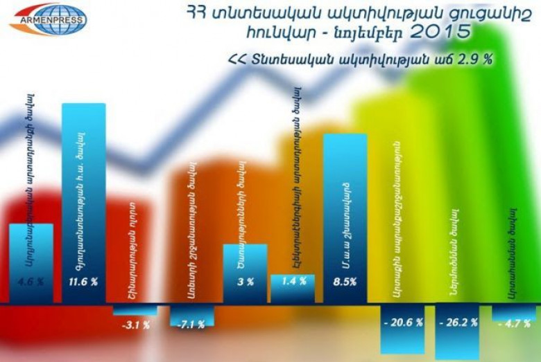 ՏնտեսությունՀայաստանի տնտեսական ակտիվության ցուցանիշը 2015 թվականի հունվար-նոյեմբերին 2,9 տոկոսով գերազանցել է նախորդ տարվա նույն ժամանակահատվածի ցուցանիշը: ՀՀ ազգային վիճակագրական ծառայությունը ներկայացրել է երկրի սոցիալ-տնտեսական վիճակը բնութագրող ընթացիկ-օպերատիվ ամփոփմամբ ստացված նախնական հիմնական մակրոտնտեսական ցուցանիշները: Երկարատև աճից հետո կրկին անկում է գրանցել շինարարությունը: Նվազել են նաև առևտրի շրջանառության, արտաքին առևտրաշրջանառության ցուցանիշները: