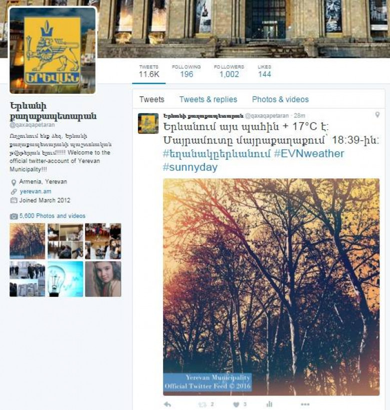 Մայրաքաղաքային անցուդարձը Twitter-ում՝ Երևանի քաղաքապետարանի պաշտոնական էջում
