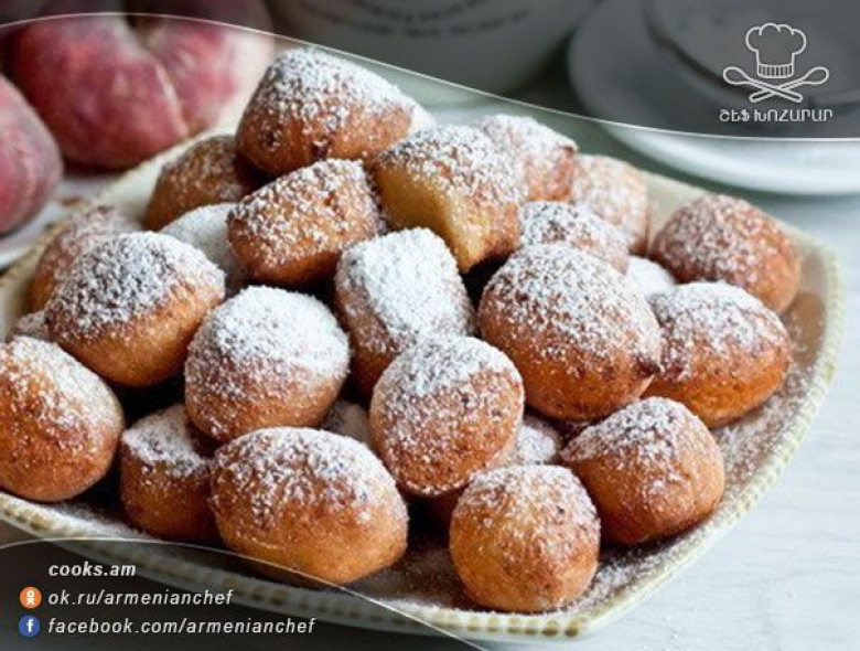 Մատուցելուց առաջ կաթնաշոռով փքաբլիթների վրա շաղ ենք տալիս շաքարի փոշի։