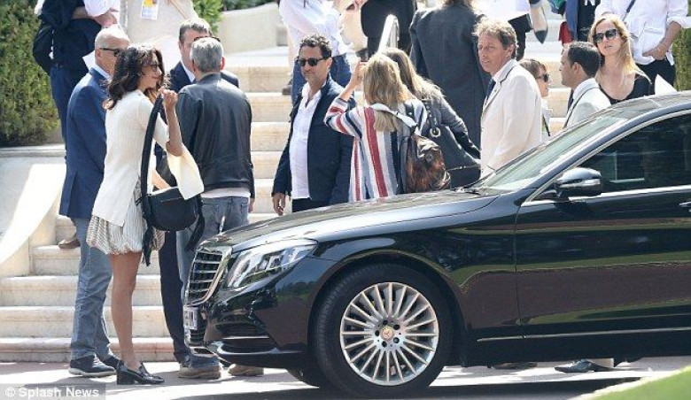 Forgotten something? Amal seemed to stop for a moment to check something in her bag before heading into the hotel