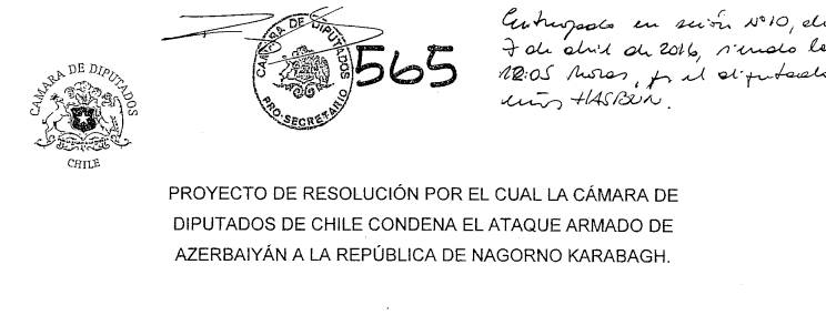 Հիշեցնենք, որ քիչ առաջ ապրիլի 1-2-ը Լեռնային Ղարաբաղի Հանրապետությունում ստեղծված իրավիճակի կապակցությամբ բանաձև է ընդունել Չիլիի Պատգամավորների պալատը: