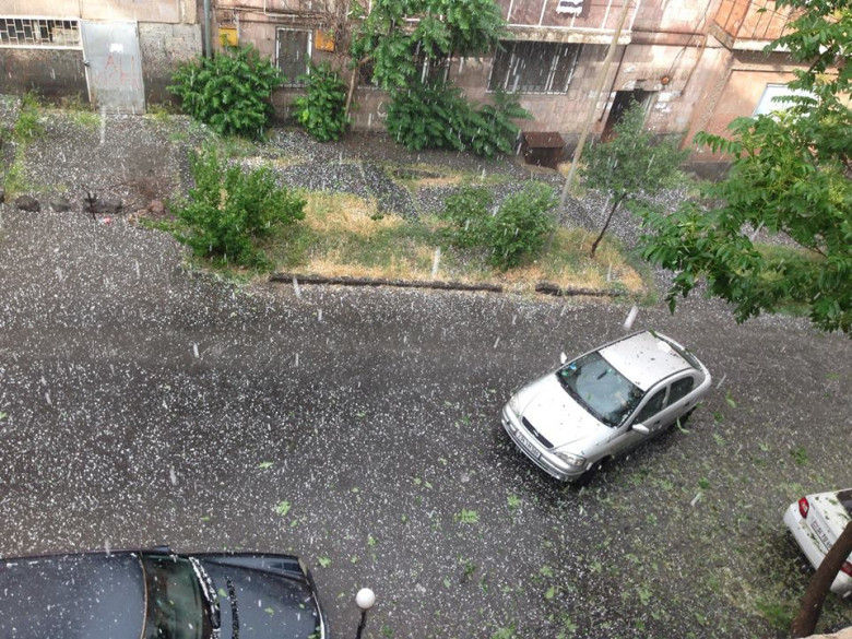 Մայրաքաղաքում մինչ կարկուտն արևոտ եղանակ էր և հանկարծ միանգամից սկսեց կարկուտ տեղալ, որը տևեց ավելի քան 5 րոպե: Կարկուտի հատիկները բավականին մեծ էին: