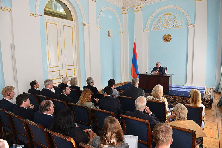 Սերժ Սարգսյանը պատրաստակամություն է հայտնել պատասխանել հանդիպման մասնակիցներին հետաքրքրող հարցերին, որոնք վերաբերել են ինչպես ԼՂ հակամարտության կարգավորման բանակցային գործընթացի ներկա փուլին, առկա խնդիրներին և հեռանկարին, ս.թ. ապրիլի սկզբին ԼՂ-ի հետ շփման գծում Ադրբեջանի կողմից 1994թ. Զինադադարի համաձայնագրի կոպիտ խախտմանն ու ԼՂ ժողովրդի նկատմամբ աննախադեպ ագրեսիային, այնպես էլ Հայաստանի ԵԱՏՄ անդամակցությամբ մեր երկրի տնտեսության զարգացման, նաև օտարերկրյա ներդրումների համար ստեղծված նոր հնարավորություններին ու բարենպաստ պայմաններին, Հայաստան-Եվրամիություն համագործակցությանը և դրա զարգացմանը միտված նոր շրջանակային համաձայնագրի շուրջ բանակցություններին, Հայոց ցեղասպանության ճանաչման ու դատապարտման միջազգային գործընթացին, համայն մարդկության համար այդ գործընթացի կարևորությանը, ինչպես նաև տարածաշրջանային խնդիրներին ու զարգացման հեռանկարին, ՀՀ տնտեսության առաջնահերթություններին, ՀՀ-ՌԴ հարաբերություններին և մի շարք այլ թեմաների: