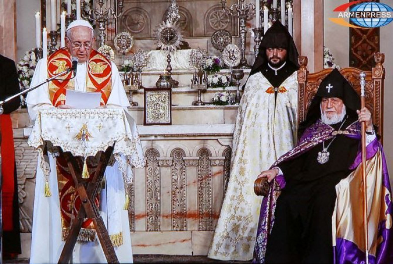 «Գոհունակություն եմ հայտնում Տիրոջը նաեւ այն ընթացքի համար, որ Կաթողիկե Եկեղեցին եւ Հայ Առաքելական Եկեղեցին կատարեցին եղբայրական եւ անկեղծ երկխոսության միջոցով լիարժեք կիսելու գոհության սեղանը: Սուրբ հոգին թող օգնի մեզ իրականացնելու այն միությունը, որի համար աղոթեց մեր Տերը, որպեսզի իր աշակերտները միասին լինեն եւ աշխարհը հավատա: Ինձ հաճելի է հիշել այժմ, մեր երկու եկեղեցիների միջեւ հարաբերությունների խորացման եւ երկխոսության ամրապնդման վերջերս տված վճռորոշ մղումը Նորին սրբություններ Վազգեն Ա-ի եւ Գարեգին Ա-ի եւ սուրբ Հովհաննես Պողոս Բ-ի եւ Բենեդիկտոս 16-ի կողմից: Համամիութենական այս ջանքերիհատկապես նշանակալից փուլերի շարքում հիշում եմ հավատի վկաների հիշատակությունը, 2000 թվականի Մեծ Հոբելեանի շրջանակներում. Ձերդ Սրբության հանձնումը քրիստոնյա Հայաստանի հոր՝ Ս. Գրիգոր Լուսավորչի մասունքին՝ Երեւանի նորակառույց տաճարի համար. Նորին Սրբություն Հովհաննես Պողոս Բ-ի եւ Ձերդ Սրբության ստորագրած համատեղ հայտարարությունը՝ ճիշտ այստեղ, Սուրբ Էջմիածնում. ինչպես նաեւ Ձերդ Սրբության կատարած այցերը Վատիկան, կարեւոր պահերի եւ հիշատակությունների առիթով»,-«Արմենպրես»-ի հաղորդմամբ` ասաց Ֆրանցիսկոս Պապը: