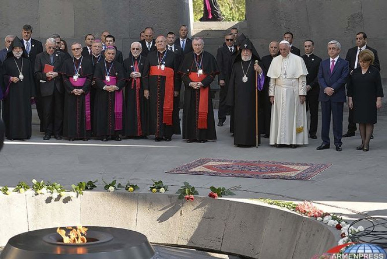 Հռոմի Սրբազան Քահանայապետ Ֆրանցիսկոս Պապն այցելել է Ծիծեռնակաբերդ՝ Հայոց ցեղասպանության զոհերի հիշատակին նվիրված հուշահամալիր, ծաղկեպսակ է դրել հուշակոթողին և աղոթել: Հռոմի Պապը ՀՀ Նախագահի և Ամենայն Հայոց Կաթողիկոսի հետ այնուհետև ծաղիկներ է խոնարհել անմեղ զոհերի հիշատակը հավերժացնող անմար կրակի մոտ, որտեղ հոգևոր դասը կատարել է Բարեխոսական կարգի արարողություն՝ հայցելով այլևս սրբադասված նահատակների բարեխոսությունը: Ֆրանցիսկոս Պապն այցելել է Ծիծեռնակաբերդի հուշահամալիրի Հիշողությունների պուրակ՝ օրհնել իր անվամբ տնկված եղևն ին, որից հետո գրառում է կատարել Հայոց Ցեղասպանության թանգարան-ինստիտուտի պատվո այցելուների գրքում: «Այստեղ աղոթում եմ՝ ցավը սրտիս մեջ, որպեսզի այլևս երբեք նման ողբերգություններ, ինչպիսին սա է, չկրկնվեն, որպեսզի մարդկությունը չմոռանա և իմանա չարությանը բարությամբ հաղթել: Թող Աստված պարգևի սիրեցյալ հայ ժողովրդին և ամբողջ աշխարհին խաղաղություն և մխիթարություն: Աստված պահպանի հայ ժողովրդի հիշողությունը: Հիշողությունը չի կարելի ոչ պղտորել, ոչ մոռանալ: Հիշողությունը խաղաղության և ապագայի աղբյուրն է»,-գրել է Սրբազան Քահանայապետը: