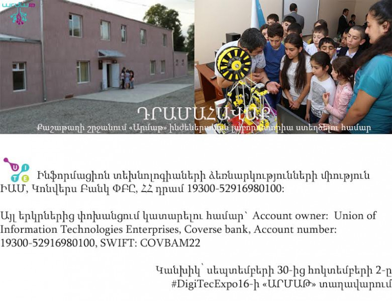 Հայաստանի տեխնոլոգիական ապագայի և դպրոցականներին որակյալ ու ժամանակակից կրթություն ապահովելու ստեղծմանն ուղղված արշավին աջակցել ցանկացողները կարող են նվիրատվություն կատարել հետևյալ հաշվեհամարով՝ Ինֆորմացիոն տեխնոլոգիաների ձեռնարկությունների միություն ԻԱՄ, Կոնվերս Բանկ ՓԲԸ, ՀՀ դրամ 19300- 52916980100: Այլ երկրներից փոխանցում կատարելու համար` Account owner: Union of Information Technologies Enterprises, Coverse bank, Account number: 19300-52916980100, SWIFT: COVBAM22: