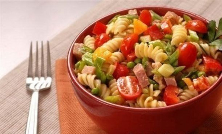 Մակարոնը եփեք նախապես աղ լցրած ջրի մեջ, հետո քամեք և թողեք՝ սառի: Լոլիկը, խոզապուխտն ու պղպեղը կտրատեք հավասարաչափ, պանիրն անցկացրեք խոշոր քերիչով: Այդ ամենը խառնեք՝ վրան մայոնեզ ավելացնելով: Անուշ լինի: