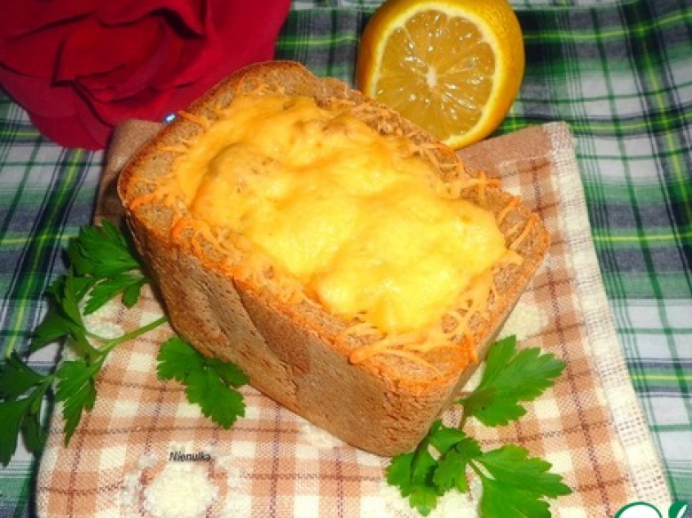 Լցնել միջուկը հացի մեջ, քերել պանիրը, դնել ջեռոց 200 աստիճանով 25 րոպե։