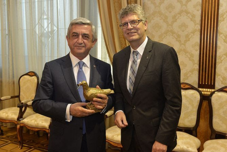 Բունդեսթագի պատգամավոր Քրիստիան Հազեն ՀՀ Նախագահին է հանձնել ՄԱԿ-ի Մարդու իրավունքների դրույթների համաձայն 2008թ. ձուլված 29 բրոնզե աղավնիներից մեկը: Աղավնին տրվում է այն քաղաքական, պետական գործիչներին, ովքեր պայքարում են խաղաղության և հատկապես կրոնական ազատությունների համար: