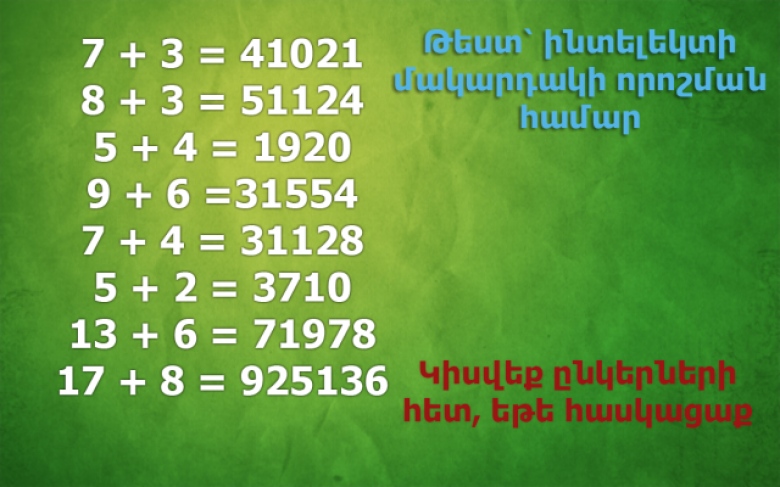 Թեստ՝ ինտելեկտի մակարդակի որոշման համար Lifestyle 7 Հոկտեմբեր, 2016 21:13 Կիսվել Ճիշտ պատասխանն այստեղ: Կիսվել