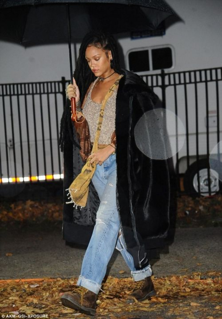 28-ամյա երգչուհին երեկոյան հայտնվել է հսկայական սեւ մորթե վերարկուով, եւ քանի որ անձրեւ է տեղացել, Ռիրին թաքնվել է ոչ պակաս հսկայական անձրեւանոցի տակ:
