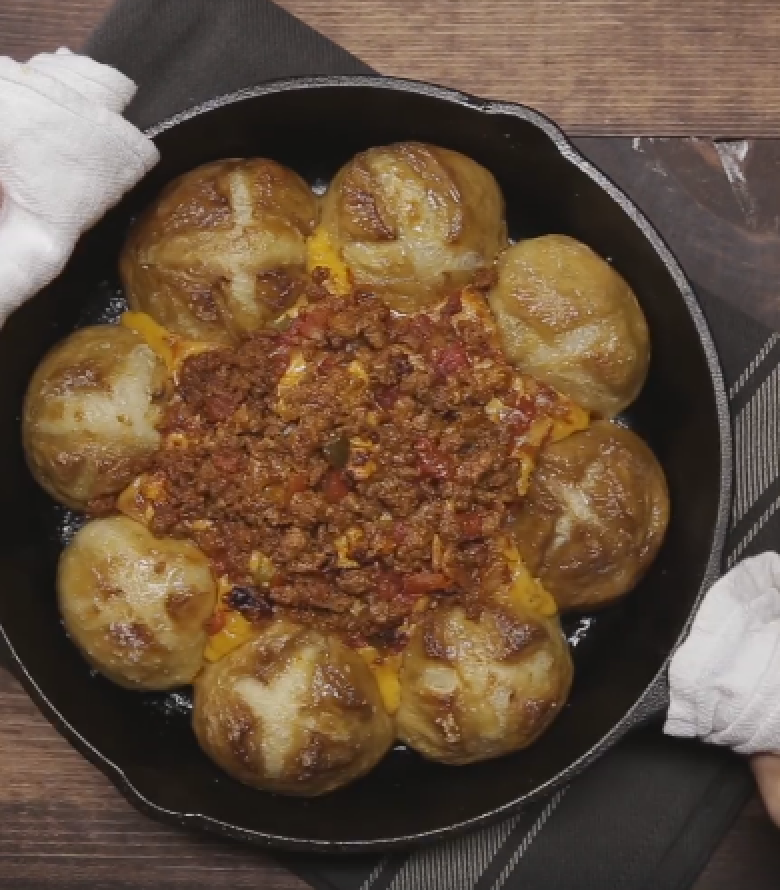 Շարել ջեռոցի ամանի մեջ, միսը տապակել, ավելացնել պանիր, լոլիկ, պղպեղ, լցնել գնդերի կենտրոնում, թխել ջեռոցում։