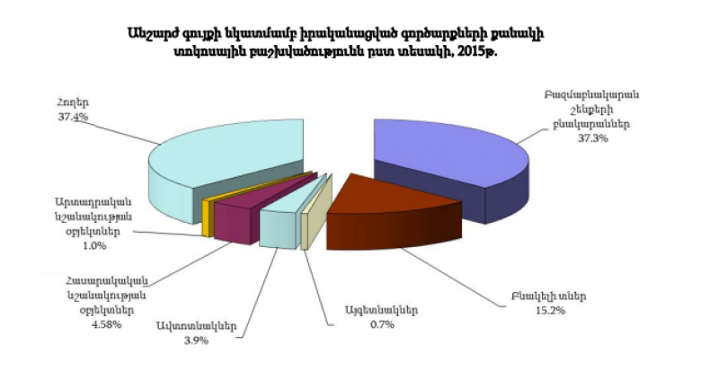 Բնակելի տների նկատմամբ իրականացված գործարքների կշիռը 15.2% է, հասարակական նշանակության օբյեկտներինը՝ 4.58%, ավտոտնակներինը՝ 3.9%, արտադրական նշանակության օբյեկտներինը՝ 1%, այգետնակներինը՝ 0.7%։