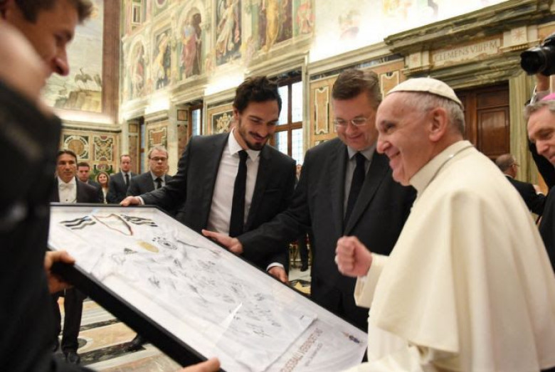 Արմենպրեսի հաղորդմամբ՝ Սան-Մարինոյի դեմ խաղից հետո, որտեղ աշխարհի գործող չեմպիոնները հաղթեցին 8:0 հաշվով, Մունդիալի հաղթողները հանդիպել են Հռոմի Սրբազան հայրապետին: Հանդիպման ընթացքում գերմանացիները Ֆրանցիսկոս Պապրին են նվիրել ազգային թիմի մարզաշապիկը՝ ընտրանու ֆուտբոլիստների ստորագրությամբ: