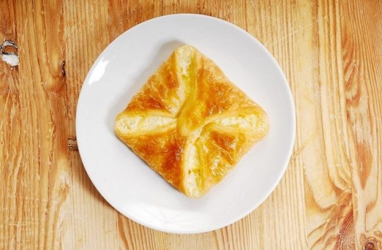 4. Պանիրը քերել խոշոր քերիչով, ավելացնել 20 գ կարագ և 1 ձու: Լավ խառնել: Ամեն քառակուսու վրա դնել 60 գ պանրային խճողակ և ծայրերն ամրացնել իրար ծրարի նման: