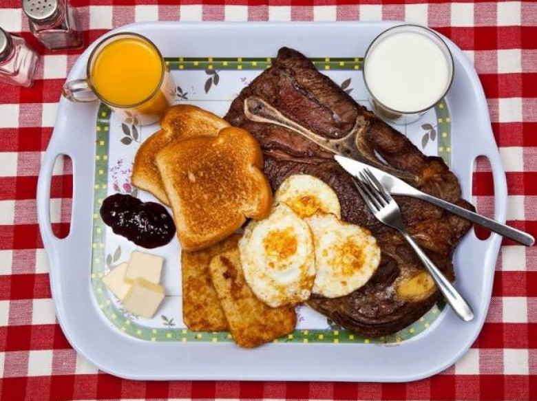 Սթեյք, ձվածեղ, կարկանդակներ, կարագ և դոնդող, կաթ և հյութ: