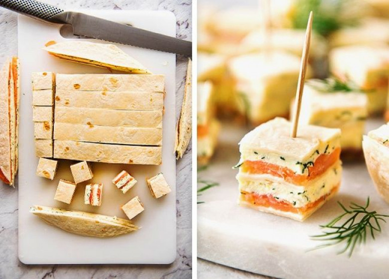 Նախ խառնեք միջուկի բաղադրիչները: Խառնուրդի կեսը քսեք լավաշներից մեկի վրա, հաշվի առեք, որ լավաշի ծայրերը կտրվելու են: Վերևից դրեք սաղմոնի կեսը: Մյուս լավաշի վրա քսեք մի փոքր կարագ և այդ կողմով դրեք սաղմոնի վրա, այդպիսով սաղմոնը կամրանա լավաշին: Այնուհետև լավաշին քսեք միջուկի մնացած մասը, վրան դրեք սաղմոնը և 3-րդ լավաշի շերտը վրան կարագ քսած, այդ կողմով դեպի սաղմոնը: Փաթաթեք սննդային թաղանթով (пищевая пленка) և 4 ժամով դրեք սառնարան (կարելի է թողնել ողջ գիշեր): Հանելուց հետո կտրեք լավաշի ավելորդ հատվածները՝ հաղորդելով քառակուսու (ուղղանկյունու) տեսք: Այնուհետև ամբողջից առանձնացրեք քառակուսիներ և դրանցից յուրաքանչյուրը ծակեք ատամի փայտիկով: