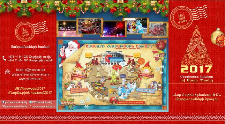 Այս տարի մայրաքաղաքում տոնական միջոցառումները կշարունակվեն մինչև 2017 թվականի հունվարի 13-ը ներառյալ: Բուկլետում զետեղված է նաև սահադաշտերի, սննդի և ժամանցի այլ վայրերի մասին տեղեկատվությունը: Ի դեպ, այս տարի առաջին անգամ Ամանորի և Սուրբ ծննդյան տոների առիթով հունվարի 2-ից կգործեն Երևանի քաղաքապետարանի ենթակայության Երևան քաղաքի պատմության, «Էրեբունի» պատմահնագիտական և Ժամանակակից արվեստի թանգարանները: