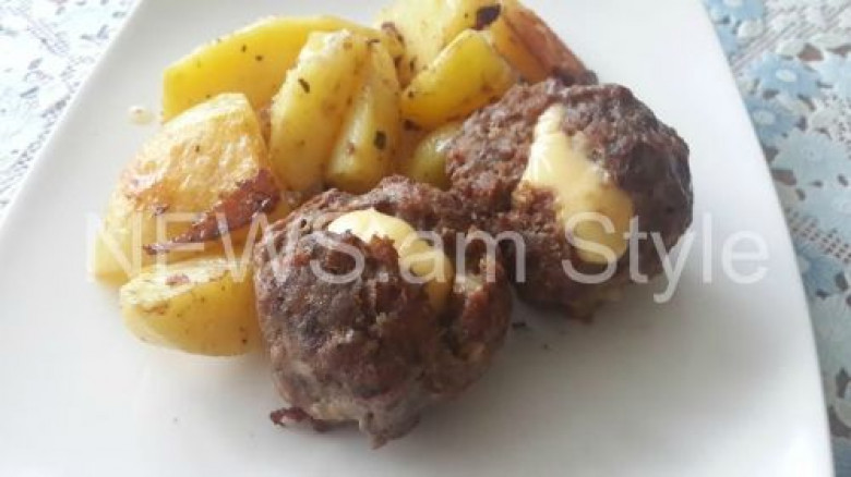 Աղացած մսին գնդիկների ձեւ ենք տալիս՝ մեջտեղում մեկ-երկու կտոր պանիր դնելով: Կարտիֆիլն ու գնդիկները դնում ենք ջեռոցի տարայի մեջ եւ 40-50 րոպե եփում 180 աստիճանով: