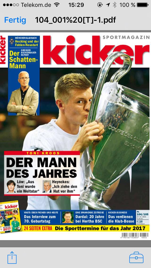 «Խմբագրությունը գոհանակություն է հայտնում Գերմանիայի հավաքականին Կրոսի՝ օրացուցային տարում նվաճումների համար, եւ տարբերակում նրան որպես անհատականություն»,- ասվում է գերմանական հեղինակավոր պարբերականի հայտարարությունում։