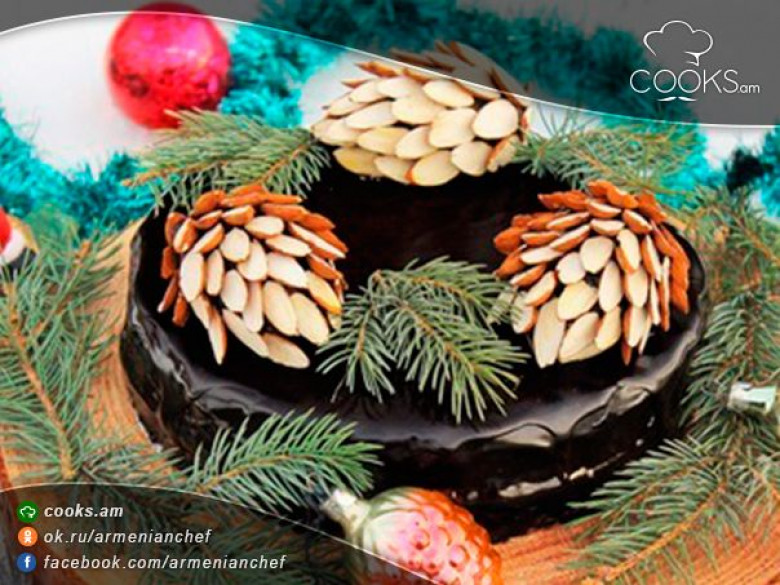 - Պատրաստում ենք շոկոլադե ջնարակը: Ջուրը, շաքարավազը, կակաոն և սերուցքը մարմանդ կրակին եփում ենք 10 րոպե: Երբ զանգվածը եռում է, հանում ենք կրակից և ավելացնում 5 ճ/գդ ջրում թրջած ժելատինը և զանգվածը հասցնում 40 աստիճանի: Այնուհետև լցնում ենք բիսկվիթի վրա և տեղափոխում սառնարան մինչ ջնարակի սառչելը: Տորթը հանում ենք սառնարանից, զարդարում կոներով և ճյուղերով: