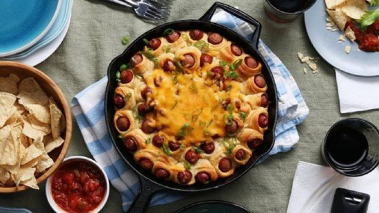Նրբերշիկները կտրատել, փաթաթել խմորի մեջ, շարել ջեռոցի ամանի մեջ ու դնել ջեռոց: