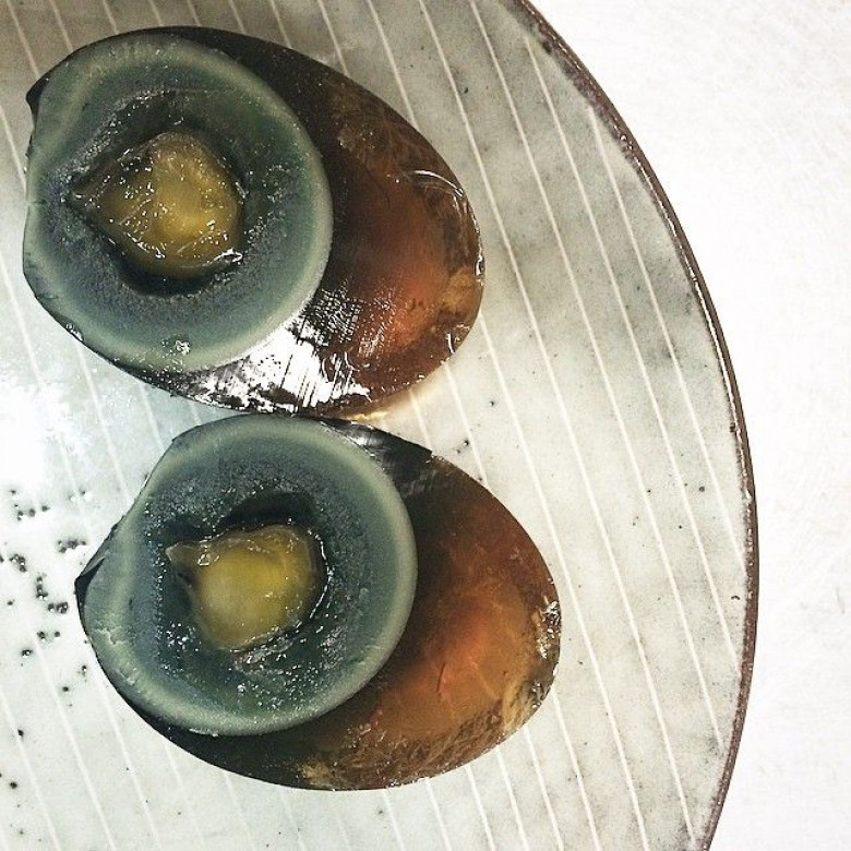 Չինացի խոհարարները հայտնի են իրենց նորարարություններով։ Նրանք վերցնում են հավի կամ բադի ձվերը, դնում դրանք աղով, լայմով և մոխրով պատրաստված լուծույթի մեջ և այդպես պահում 100 օր։ Ժամկետը լրանալուն պես դրանք հանվում են լուծույթից և մատուցվում։Թույլ նյարդերի տեր մարդկանց արգելվում է մոտենալ այս ուտեստին։
