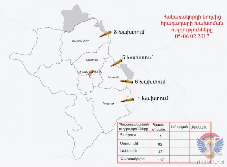 ԼՂՀ ՊՆ հայտարարության մեջ ասվում է. «Փետրվարի 5-ին և լույս 6-ի գիշերը ղարաբաղա-ադրբեջանական հակամարտ զորքերի շփման գծում հակառակորդը տարբեր տրամաչափի հրաձգային զինատեսակներից, հրադադարի պահպանման ռեժիմը խախտել է 20 անգամ՝ հայ դիրքապահների ուղղությամբ արձակելով ավելի քան 220 կրակոց: