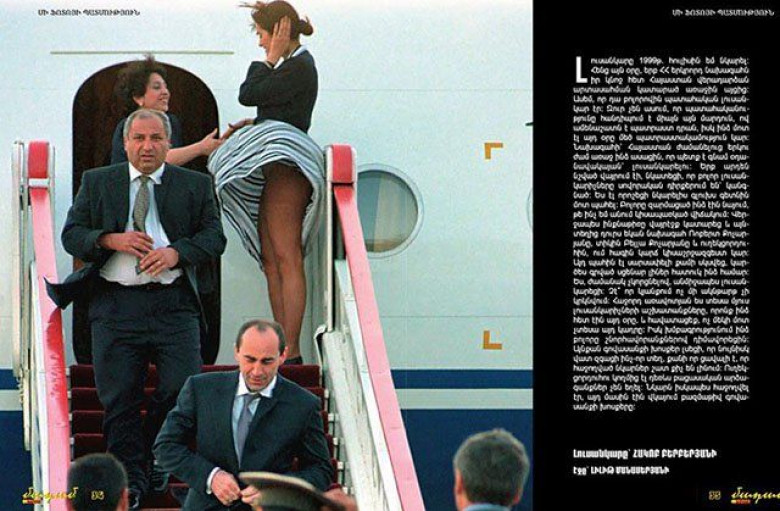 Վերջապես ինքնաթիռը վայրէջք կատարեց և այնտեղից դուրս եկան նախագահ Ռոբերտ Քոչարյանը, տիկին Բելլա Քոչարյանը և ուղեկցորդուհին, ում հագին կարճ կիսաշրջազգեստ կար: Այդ պահին էլ սարսափելի քամի սկսվեց, կարծես գրված սցենար լիներ հատուկ ինձ համար: Ես, ժամանակ չկորցնելով, անմիջապես լուսանկարեցի: