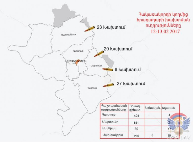 ԼՂՀ ՊՆ հայտարարության մեջ ասվում է. «Փետրվարի 12-ին և լույս 13-ի գիշերը ղարաբաղա-ադրբեջանական հակամարտ զորքերի շփման գծում արձանագրվել է լարվածության աճ: Հակառակորդը Դ-44 տիպի հրանոթներից, ականանետերից, նռնականետերից ու տարբեր տրամաչափի հրաձգային զինատեսակներից հրադադարի պահպանաման ռեժիմը խախտել է շուրջ 80 անգամ, որի ընթացքում, հայ դիրքապահների ուղղությամբ արձակել է ավելի քան 950 կրակոց: Ադրբեջանական զինուժը արևելյան ուղղությամբ կիրառել է Դ-44 տիպի հրանոթներ՝ արձակելով 13 արկ, իսկ հյուսիսային և հարավային ուղղություններոփվ՝ 60 և 82 միլիմետրանոց ականանետեր ու նռնականետեր՝ ընդհանուր առմամբ արձակելով 49 արկ, որից 41-ը ականանետերից, 8-ը՝ նռնականետերից: