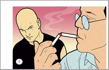 Ծխախոտի կիրառությունը չափազանց արդյունավետ է, քանի որ, որպես կանոն, կռիվների 56%-ը սկսվում է «Ծխելու կա՞, ապե» արտահայտությամբ։ Այդ արտահայտությունը լսելով՝ հանգիստ հանեք ձեր ծխախոտը և վառեք, հետո վերցրեք երկրորդը և վառեք արդեն վառվող գլանակի օգնությամբ։ Հետաքրքրվելով ձեր տարօրինակ պահվածքով՝ հակառակորդը լայն կբացի աչքերը։ Բաց մի՛ թողեք այդ պահը և վառվող գլանակը մտցրեք հակառակորդի աչքը։ Ցավից դրդված՝ հակառակորդը մեկ ձեռքով կբռնի վնասված տեսողական օրգանը և կկարողանա կռվել միայն մեկ ձեռքով։ Օգտվելով այդ հանգամանքից՝ մյուս գլանակը մտցրեք հակառակորդի մյուս աչքը։ Այդ կերպ դուք կվնասազերծեք նրա երկրորդ ձեռքը։ Հետո պտտեք հակառակորդին, որպեսզի նա կորցնի տարածական կողմնորոշումը, իսկ դուք կկարողանաք փախչել։