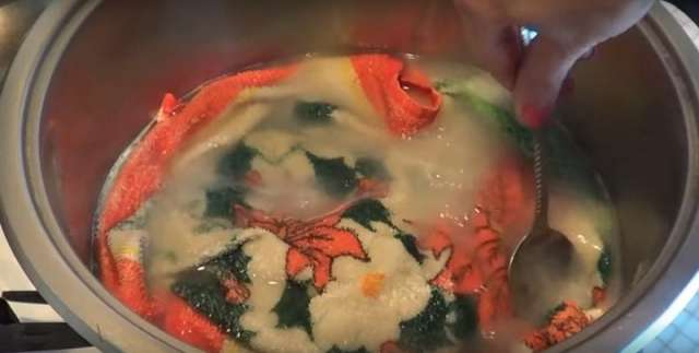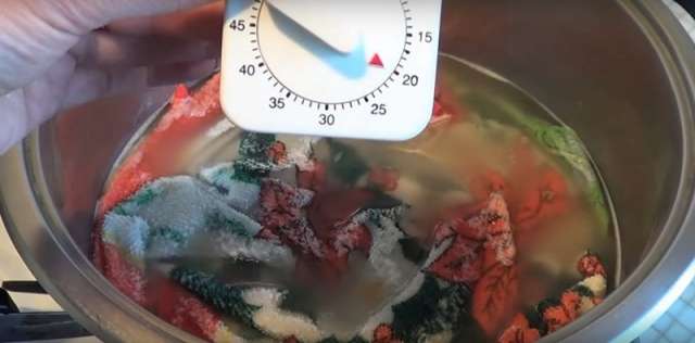 3. Երբ բաղադրությունը եռա, կրակն իջեցրու և շարունակիր սրբիչները եռացնել ևս 20 րոպե: Եթե դրանք շատ վատ վիճակում են, կարելի է 30 րոպե եռացնել, բայց ոչ ավել: Հետո վեցրու կրակի վրայից և թող սառչի: