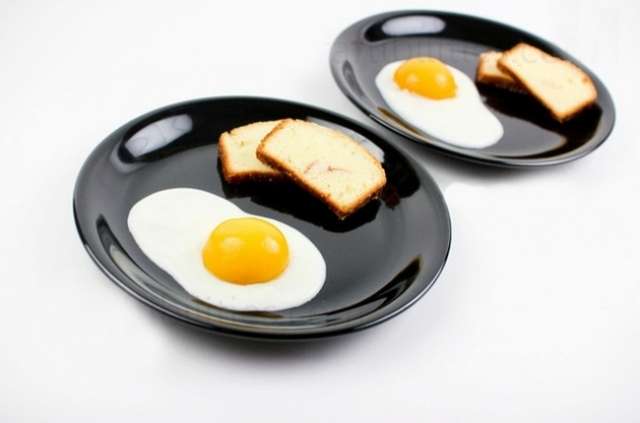 Առաջին հայացքից սա սովորական ձվածեղ է, սակայն իրականում սպիտակ մասը յոգուրտ է, իսկ դեղինը՝ պահածոյացված ծիրանի կեսը։