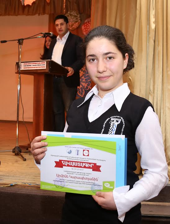 100% կրթաթոշակի արժանացած սան` Արմինե Կարապետյանին հանձնելով այդ մասին վկայող հավաստագիրը, Ucom ընկերության գլխավոր տնօրեն Հայկ Եսայանն ընգծեց. «Քանի որ Ucom ընկերությունն իր կորպորատիվ սոցիալական պատասխանատվության շրջանակներում առանձնանում է հենց կրթական նախագծերում իր ներդրումներով, այսօր մենք չէինք կարող անմասն մնալ այս միջոցառումից: Արմինե Կարապետյանին հանձնելով 100% կրթաթոշակի հավաստագիր մենք ևս մեկ անգամ ուզում ենք ընդգծել, որ անկախ երեխայի ծնողների ու հարազատների ֆինանսական հնարավորությունից ու բնակության վայրից, խելացիությունը, լավ առաջադիմությունը, ուշիմությունը, կրթվելու ցանկությունը, նպատակասլացությունը միշտ հատուցվում է: Սա մեծ աշխարհում հայտնվելու լավ հիմք է ու մեծ աշխարհին՝ ապագայում օգտակար լինելու փայլուն հնարավորություն»: