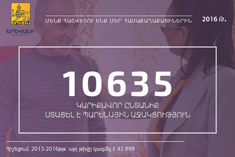 2016 թվականին մայրաքաղաքի 10635 կարիքավոր ընտանիք ստացել է պարենային աջակցություն: Երևանի քաղաքապետարանի կողմից իրականացված սոցիալական ծրագրերի շրջանակում 2013-2016թթ. պարենային աջակցություն է ստացել ընդհանուր առմամբ 42899 կարիքավոր ընտանիք: