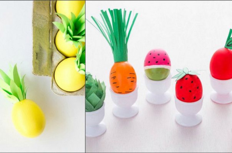 4. Հավկիթներին մրգերի ու հատապտուղների տեսք հաղորդելու համար որոշեք, թե որ մրգերի տեսքն եք ցանկանում ստանալ ու համապատասխան գույների ներկանյութեր ձեռք բերեք։ Ներկեք հավկիթը համապատասխան գույնի մեջ, վրձինով տվյալ մրգի նախշերը նկարեք ու թույլ տվեք, որ չորանա։ Մինչ հավկիթը չորանում է, թղթից տարբեր չափսերի տերևներ կտրեք ու սոսնձով փակցրեք հավկիթին։