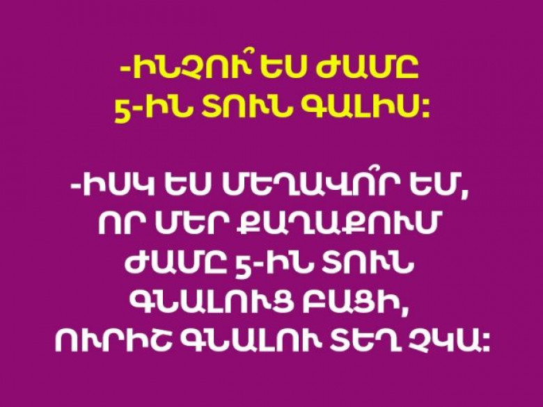 - Երեկ ձանձրացած էի և մի անծանոթ տղամարդու նկարի տակ գրեցի. «Դու ինձ չես սիրում»: Այսօր ինձ մոտ եկան նրա 365 ընկերները կնոջ գլխավորությամբ: Ուզում եմ խոսքս ուղղել այդ տղամարդուն. «Ների՛ր ինձ, եթե դեռ ողջ ես»: