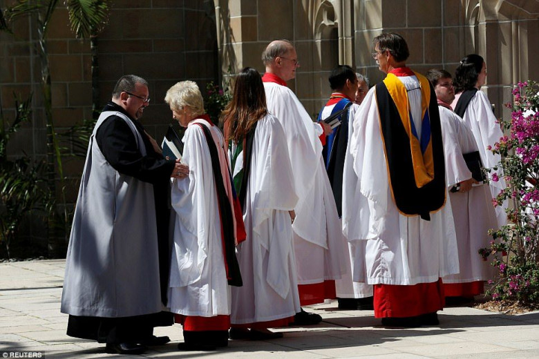 Clergy line up to enter for services at the Episcopal Church of Bethesda-by-the-Sea on Sunday morning ahead of an Easter service