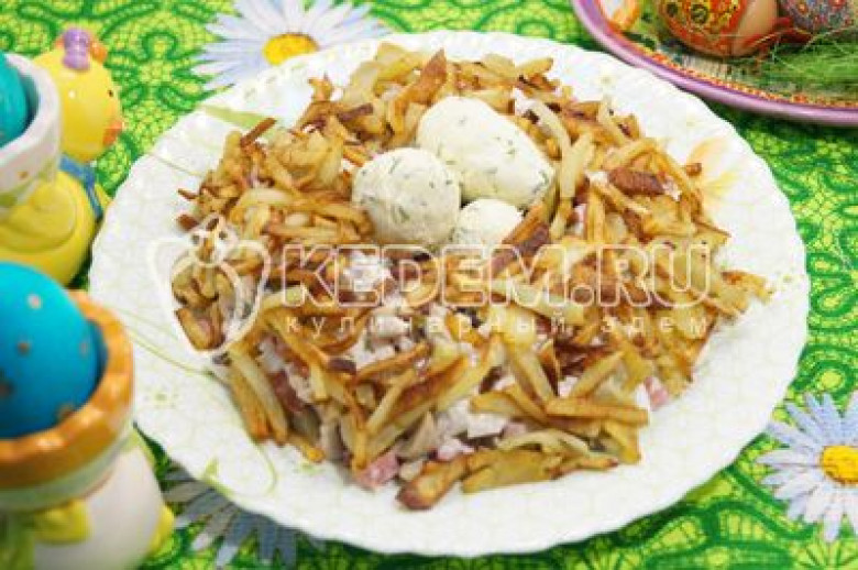Перед подачей посыпать картофелем и положить яйца в гнездо