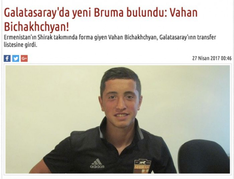 ՍպորտԳյումրիի «Շիրակը» պաշտոնապես հերքել է թուրքական մամուլում շրջանառվող լուրերը, որ 17-ամյա ֆուտբոլիստ Վահան Բիչախչյանը կարող է տեղափոխվել Ստամբուլի «Գալաթասարայ»: