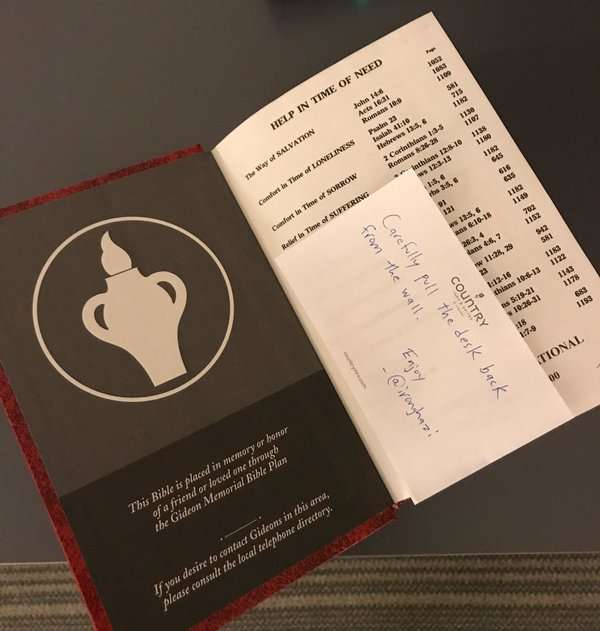Հաջորդ անգամ ամերիկյան հյուրանոցներում հայտնվելիս շատ ժամանակ հատկացրեք Աստվածաշունչ կարդալու: Այդպես էլ վարվեց այս նյութի հերոսն ու գրքի հենց առաջին էջում գրություն գտավ․ «Սեղանը զգուշությամբ հեռացրեք պատից: Վայելեք:»