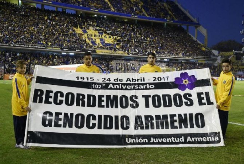ՀասարակությունՖուտբոլի Արգենտինայի առաջնության «Բոկա Խունիորս»-«Արսենալ» խաղի մեկնարկից առաջ ապրիլի 30-ին խաղադաշտում հիշատակվել է Հայոց ցեղասպանությունը՝ 102-րդ տարելիցին նվիրված մեծ պաստառի միջոցով, որը պահվել է խաղադաշտում: Ինչպես հաղորդում է Արմենպրեսը, այս մասին հայտնում է Prensa Armenia-ն: