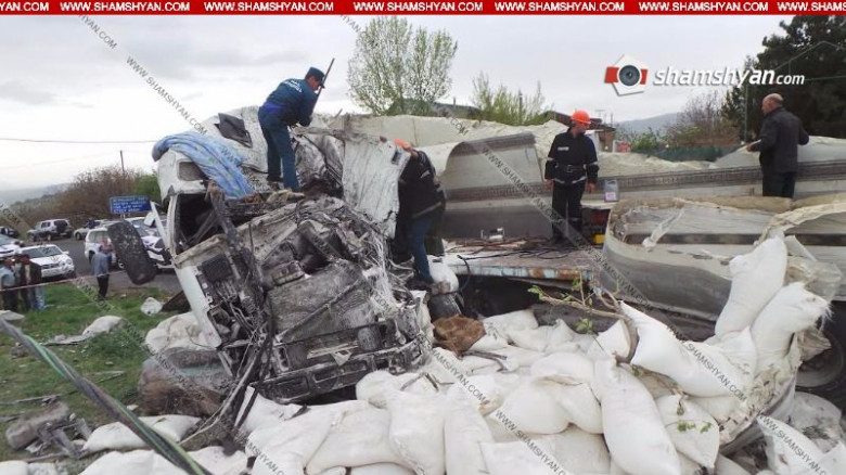Ուշիի ոլորաններում ալյուրով բարձված բեռնատարը շրջվել է. վարորդը տեղում մահացել է (ֆոտո)