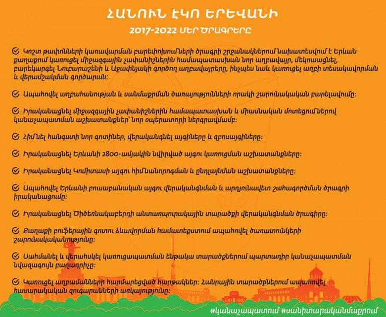 Երևանի համար նոր աղբավայրի կառուցումը և հին աղբավայրերի մեկուսացումը, աղբի տեսակավորումն ու վերամշակումը մեր առաջնահերթությունների շարքում են։ Այդ շարքում է նաև կանաչ տարածքների շարունակական ավելացումն ու խնամքը։