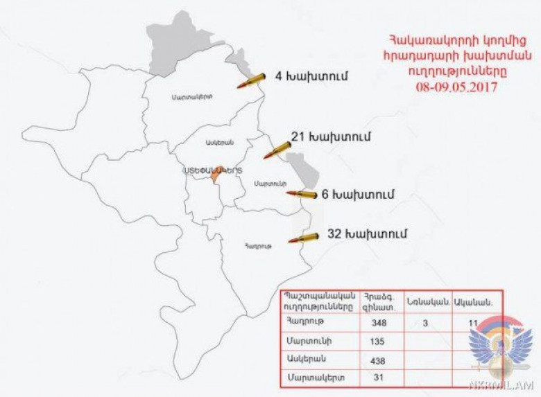 ՀասարակությունՄայիսի 8-ին եւ լույս 9-ի գիշերը արցախա-ադրբեջանական հակամարտ զորքերի շփման գծում հակառակորդը տարբեր տրամաչափի հրաձգային զինատեսակներից, հրադադարի պահպանման ռեժիմը խախտել է շուրջ 65 անգամ՝ հայ դիրքապահների ուղղությամբ արձակելով ավելի քան 970 կրակոց: Շփման գծի հարավային ուղղությամբ, բացի հրաձգային զինատեսակներից, ադրբեջանական զինուժը կիրառել է նաեւ 60 միլիմետրանոց ականանետ (11 արկ) եւ հաստոցավոր ավտոմատ նռնականետ (3 արկ):