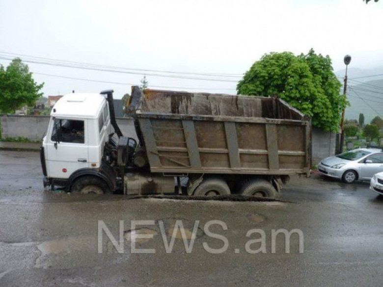 Վանաձորում ճանապարհը բեռնատարների անիվների ծանրությունից սահում է. «ԿամԱԶ»-ը արգելափակվել է փոսում (ֆոտո)
