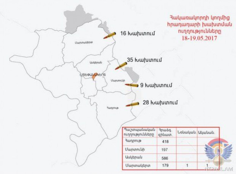 ՀասարակությունՄայիսի 18-ին եւ լույս 19-ի գիշերը արցախա-ադրբեջանական հակամարտ զորքերի շփման գծում հակառակորդը տարբեր տրամաչափի հրաձգային զինատեսակներից, հրադադարի պահպանման ռեժիմը խախտել է մոտ 90 անգամ՝ հայ դիրքապահների ուղղությամբ արձակելով ավելի քան 1300 կրակոց:
