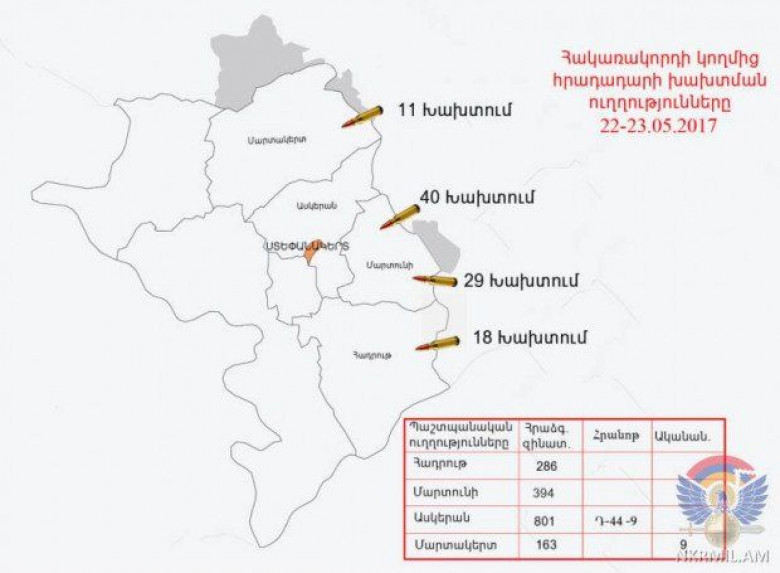 ՀասարակությունՄայիսի 22-ին եւ լույս 23-ի գիշերը արցախա-ադրբեջանական հակամարտ զորքերի շփման գծում հակառակորդը տարբեր տրամաչափի հրաձգային զինատեսակներից, հրադադարի պահպանման ռեժիմը խախտել է շուրջ 100 անգամ՝ հայ դիրքապահների ուղղությամբ արձակելով ավելի քան 1600 կրակոց: Բացի հրաձգային զինատեսակներից, ադրբեջանական զինուժը շփման գծի արեւելյան ուղղությամբ կիրառել է նաեւ Դ-44 տիպի հրանոթ (9 արկ), իսկ հյուսիսարեւելյան հատվածում՝ 82 միլիմետրանոց ականանետ (9 արկ):